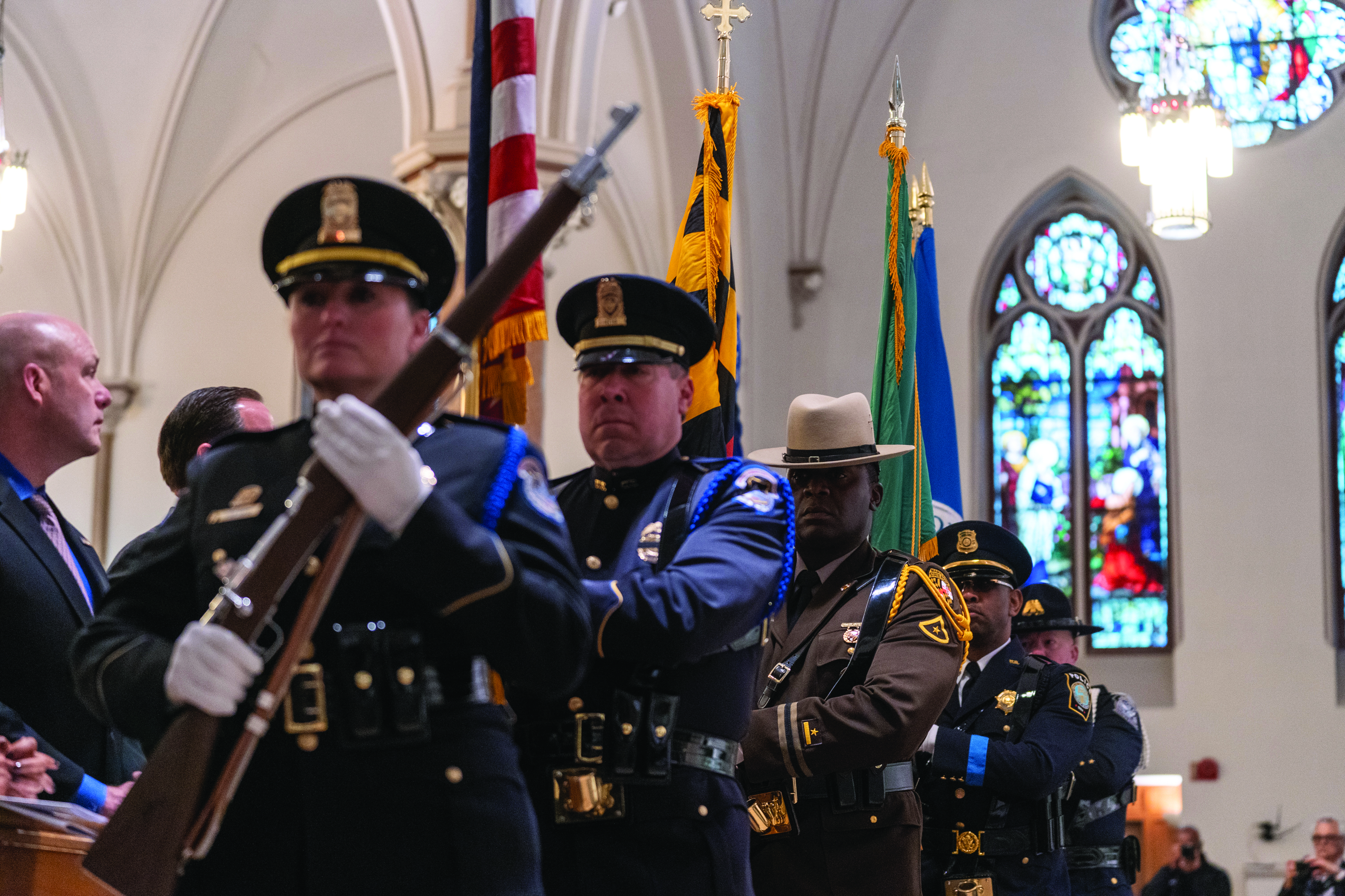 Prior to the Mass, honor guards and flag bearers from the various local, state and federal agencies that serve throughout The Roman Catholic Archdiocese of Washington and neighboring Virginia processed into the church.