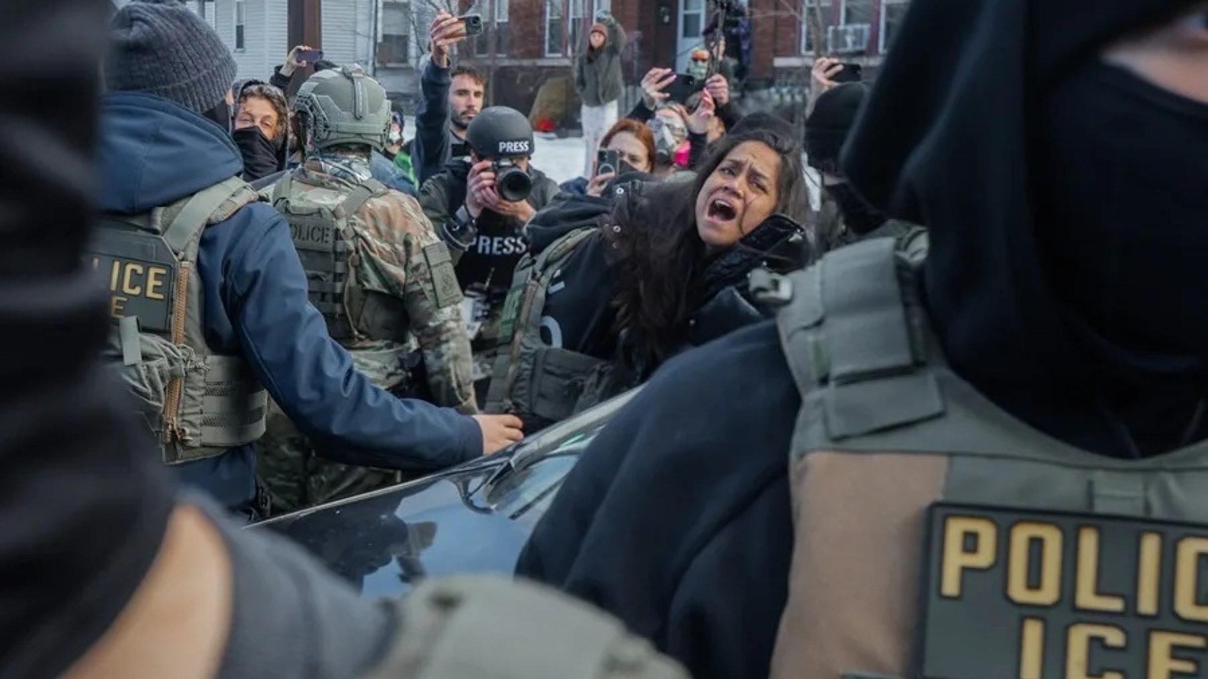 Una mujer grita mientras agentes federales de inmigración la sacan a rastras de su vehículo en Minneapolis, Minnesota. EFE/EPA/Olga Fedorova