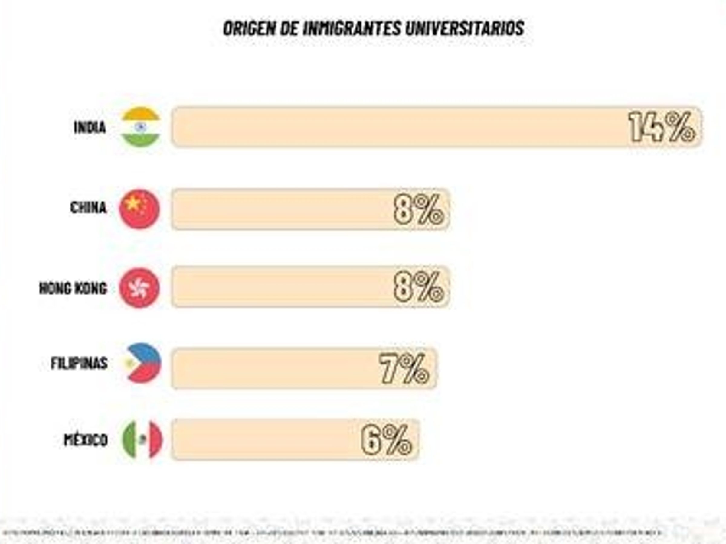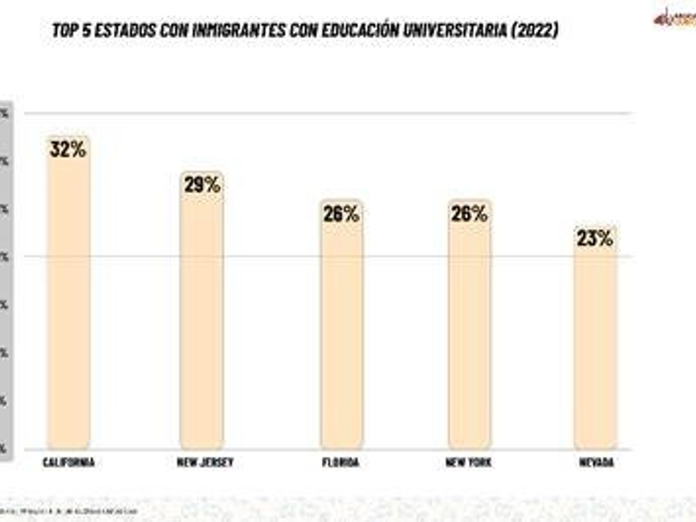 Estados como California, Nueva Jersey, Nueva York y Florida concentran las mayores proporciones de inmigrantes con educación universitaria, superando el 25% del total de adultos graduados. En contraste, estados del Medio Oeste y del Sur registran porcentajes inferiores al 5%, reflejando modelos económicos y patrones migratorios distintos, más orientados a sectores con menores requisitos formales de educación.